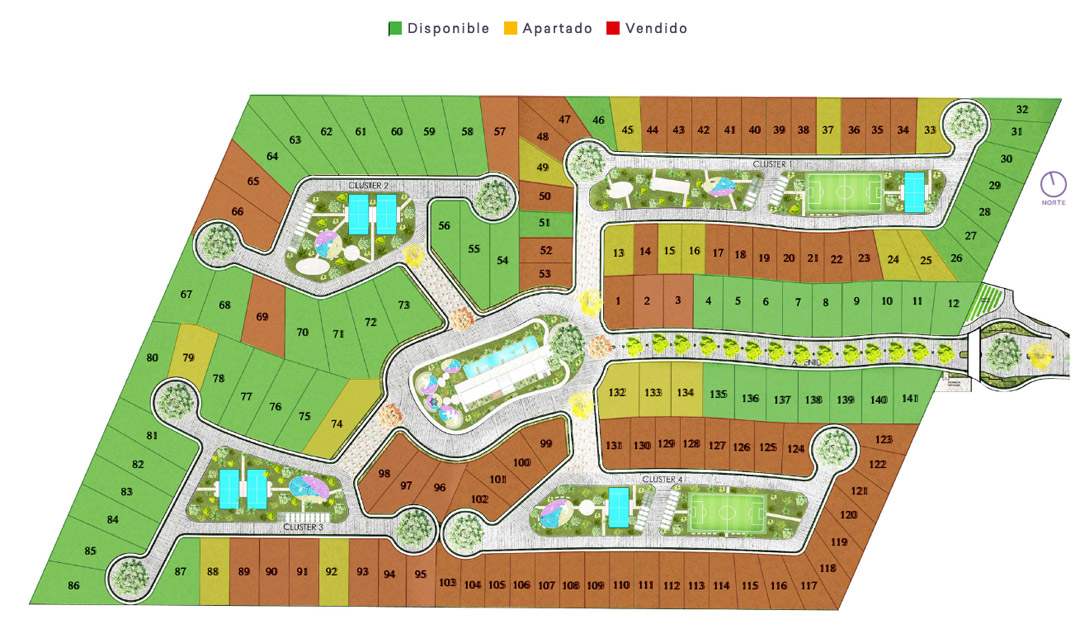 • Lotes: 141 Lotes residenciales desde 305 m2 hasta 720 m2